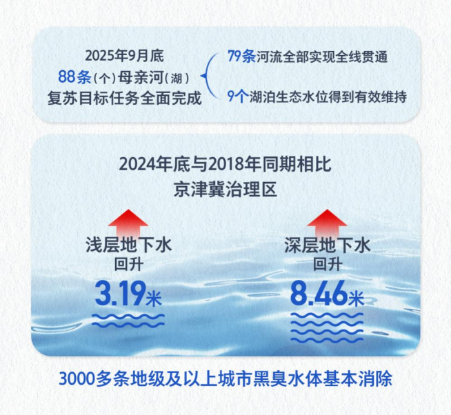 华北地区地下水水位逐年下降的趋势得到根本扭转,滹沱河、大清河、滏阳河等一批河流实现全线贯通。北京地表水国考断面全面消除劣Ⅴ类,永定河等五大主干河流全部重现“流动的河”并贯通入海。